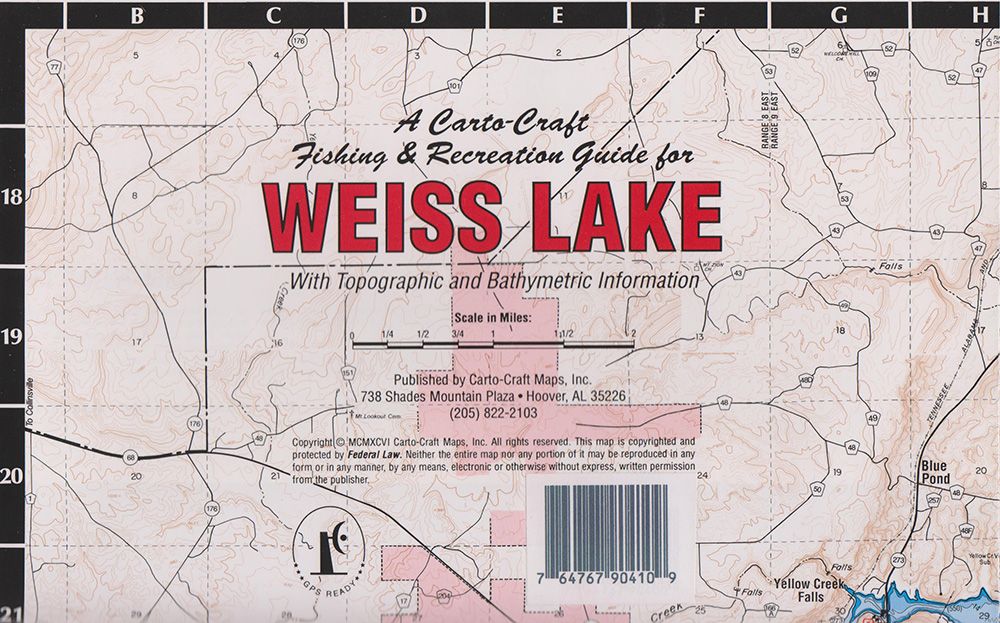 This map is great for fishing and navigating the lake on water or by road around Lake Weiss.