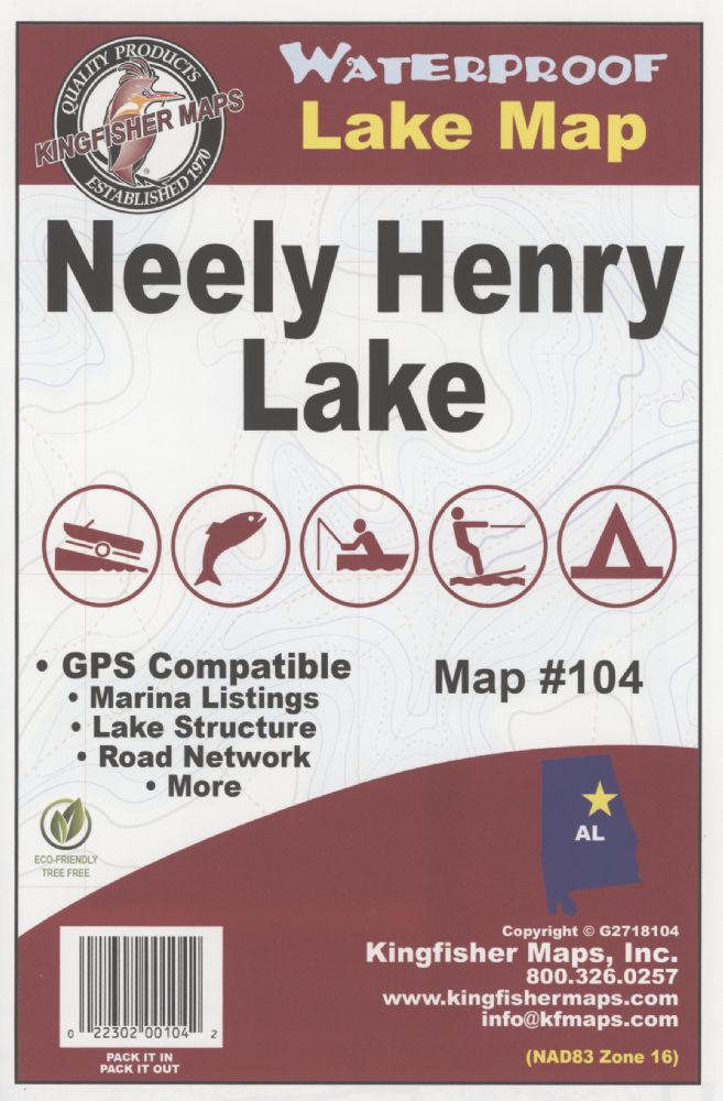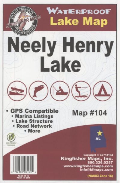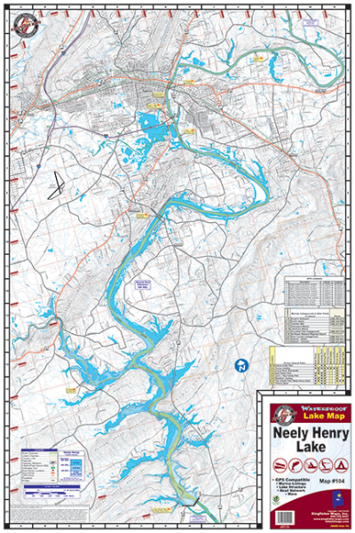 The Kingfisher Maps Waterproof Fishing Map Neely Henry Lake includes detailed coverage of Neely Henry Lake located on the Coosa River near Gadsden, Alabama. This 24″ x 36″, one-sided, topographical lake map includes marinas, campgrounds, boat ramps, contour intervals, river channel, creek channels, and more. The map is printed on a durable, waterproof, tear-resistant paper and folds down to 6″ x 9″.